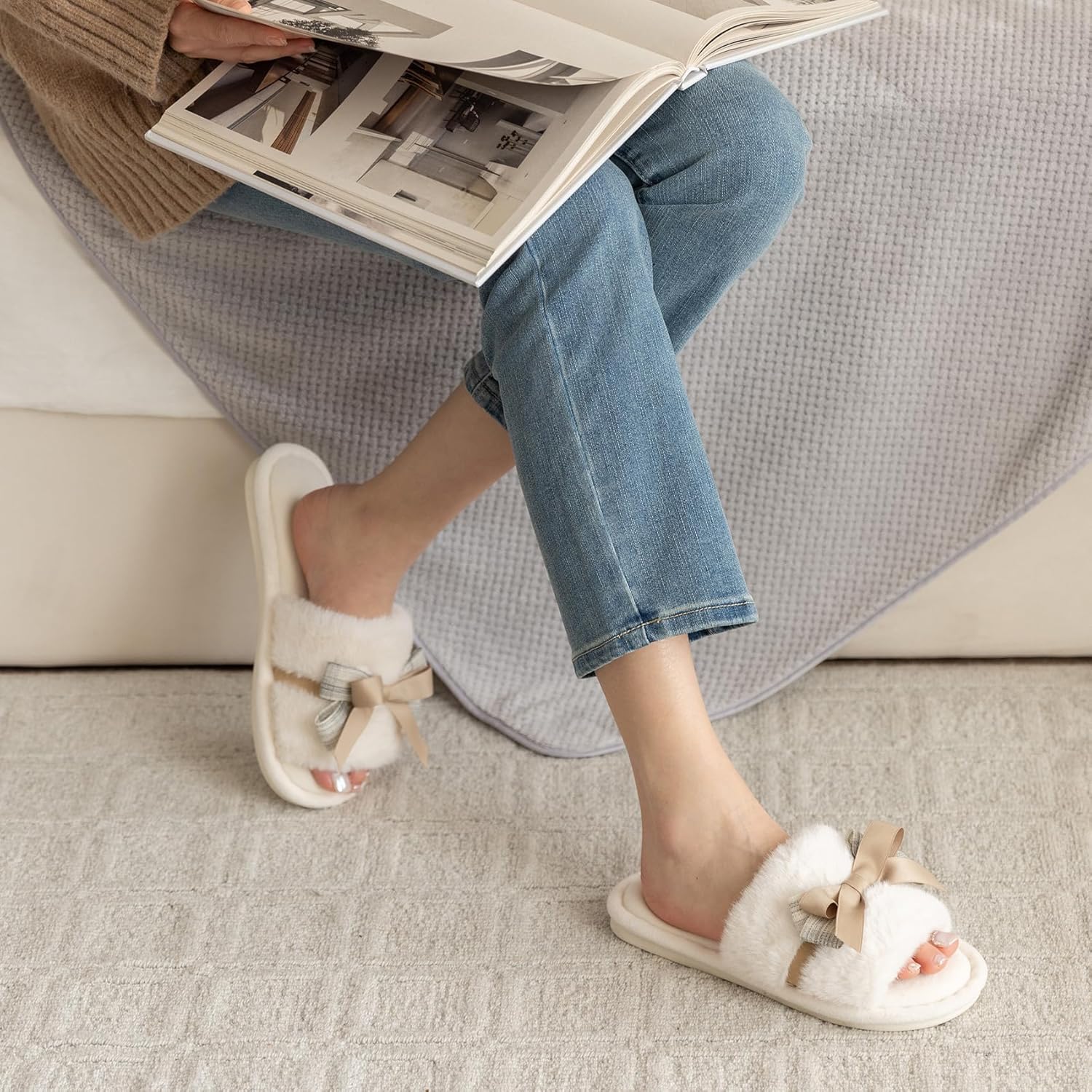 - Soft Cute Slippers:Breathable open toe design keep your feet cool and fresh in spring or summer.Available in 4 colors,Beige,gray,pink and blue,perfect for women of all ages and lifestyles.The women slippers with cute bow design and good quality material,could match well with your loungewear,pajamas,robes etc.