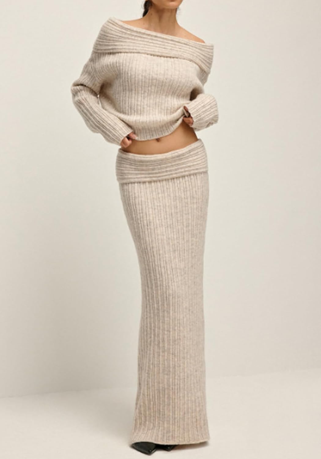 • Skirt sets women 2 piece outfits: Consisting of a long sleeve off shoulder ribbed cable knit sweater top and high waist bodycon long skirts, these women’s 2 piece sweater sets combine slimming and comfortable casual styles to set the trend for 2025.