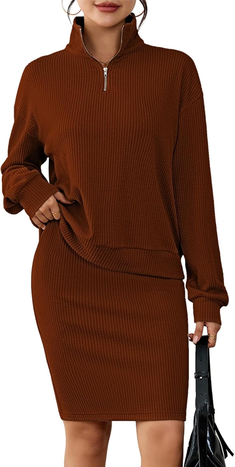 Women 2 Piece Outfits Long Sleeve Quarter Zip Collared Top Ribbed Knit Bodycon Mini Skirt Sets with Back Slit 2025
