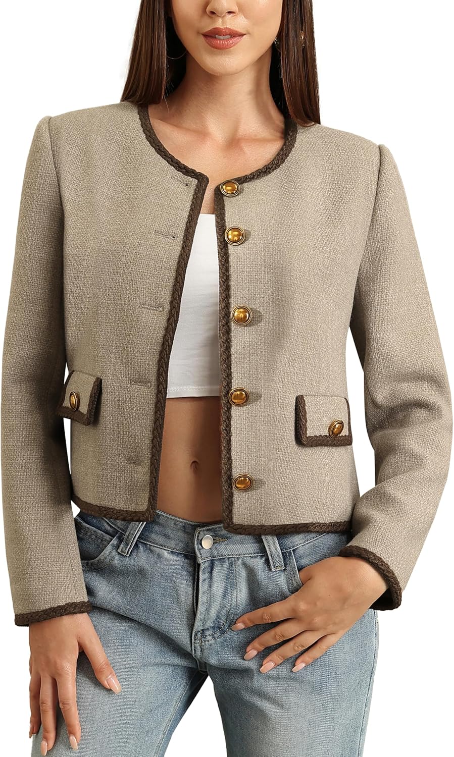 • Womens cropped tweed jacket features with soft fabric, collaredless, 2 functional pockets, long sleeve, vintage golden button closure, open front. 2025 classical fall shackets outerwear for old money style.