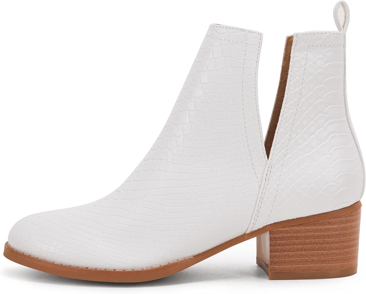 • FEATURES – ankle booties for women, chunky stacked heel, cute almond toe, side deep v cutout, back pull-tab, hollow out, faux leather, snake print and solid color